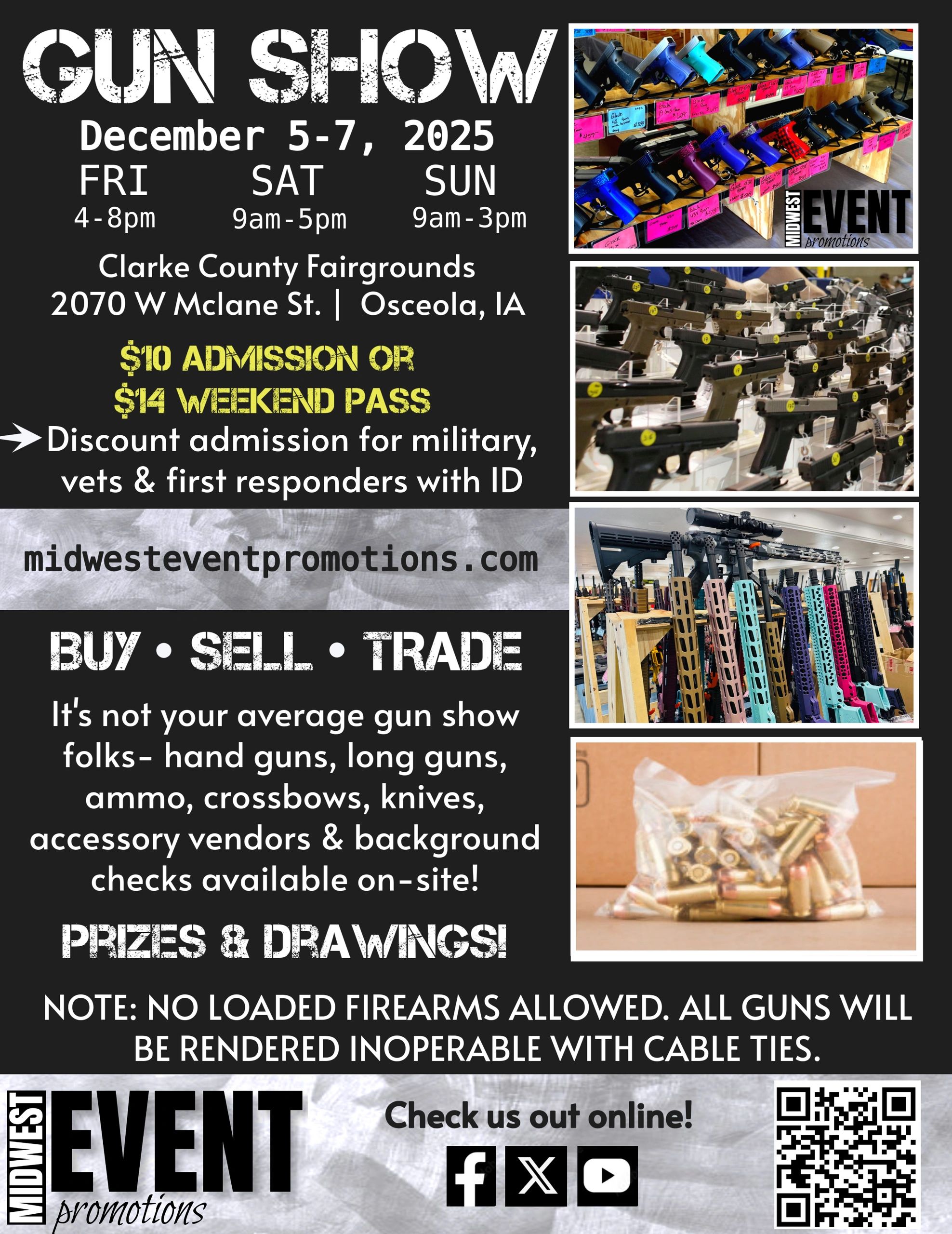 Midwest Event Promotions is a strong supporter of Constitutional Rights, veterans, police & fire, US armed services and every other foundation that built this great country! Though our expertise rests strongly in firearms & hunting ventures, we boast a well-rounded staff with amazing organizational skills, great connections and a desire to bring events to communities all over. If you want to bring an event to your area, create a new event, or sell your goods at one of our scheduled events, reach out to us today. Don’t be afraid to think outside the box because we’re not afraid to step outside the box!